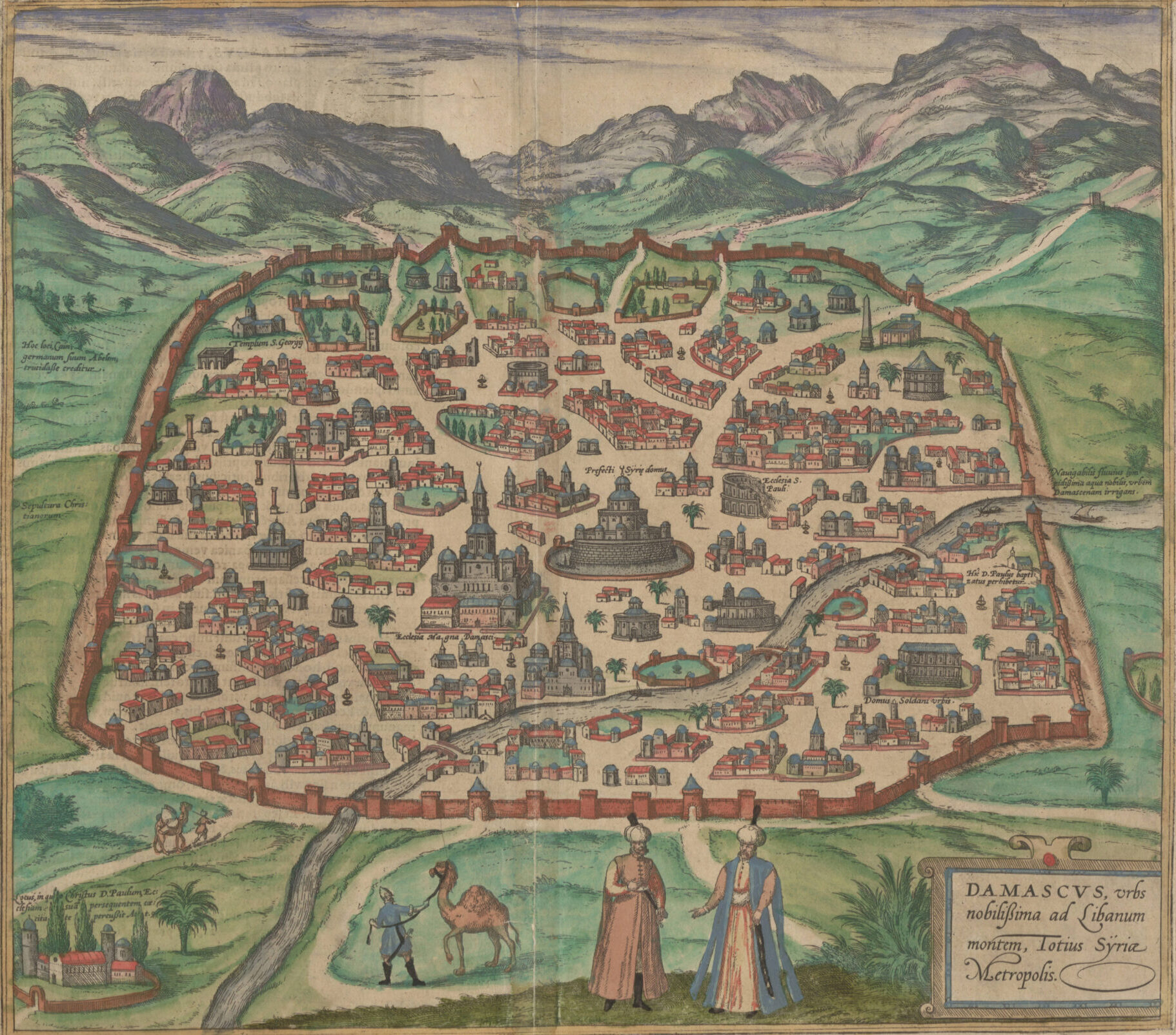 This is a superb example of the 1575 view of Damascus, produced by Braun and Hogenberg for inclusion in the second volume of their Civitates Orbis Terrarum, the first dedicated city book. The beautifully engraved view, illuminated with superb original color, is one of the earliest printed views of Damascus. It depicts the contemporaneous Muslim walled city; its mosques are prominently shown. Some churches illustrated as well, though one of these, The Church of Saint Paul, is in ruins. In the foreground, two noblemen in Ottoman styles converse; two footmen can be seen leading camels.