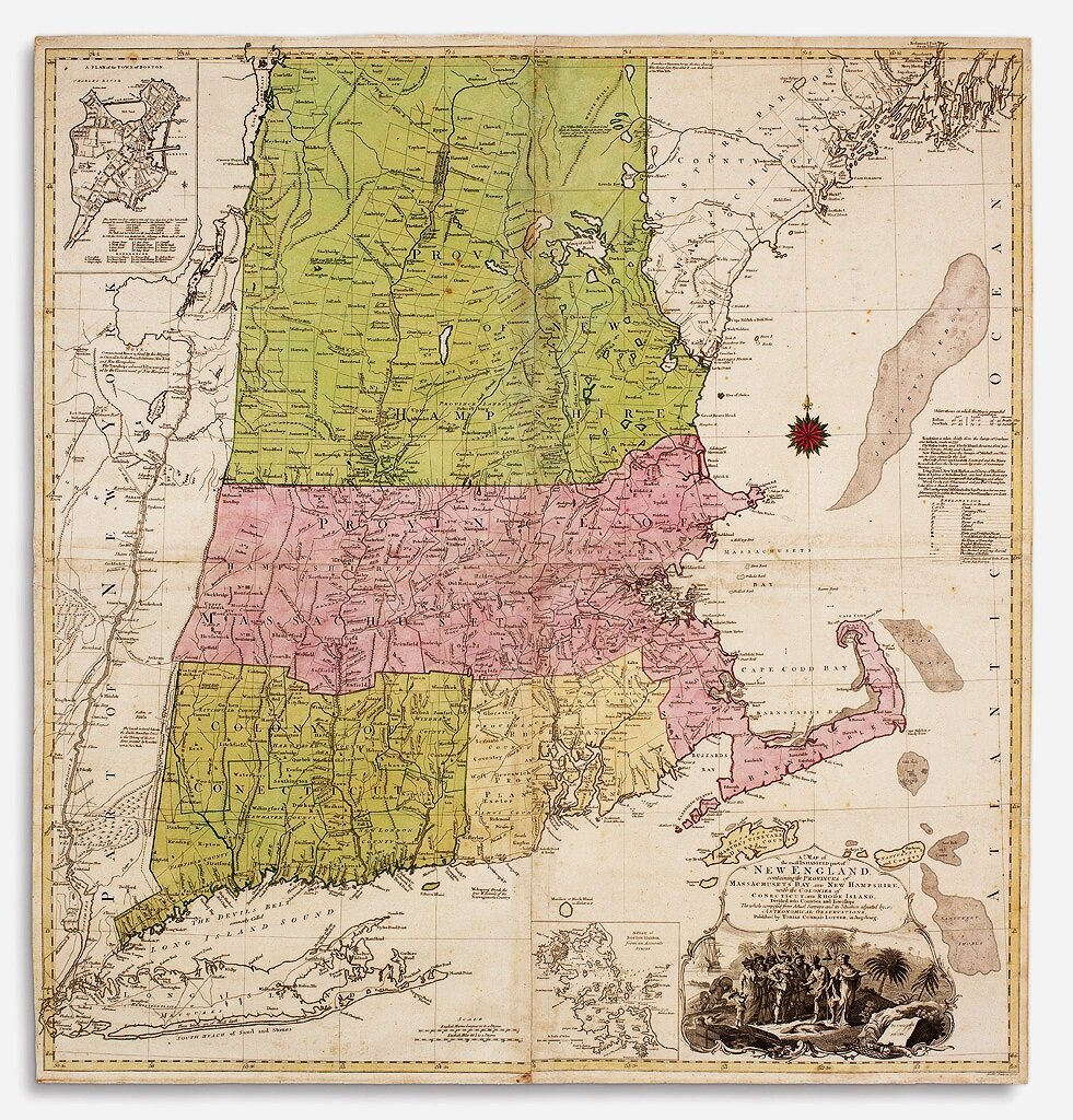 Meade used William Douglass’s 1753 map of New England as a base map, but adds a great deal of material taken from other sources. The township jurisdictions in what are now New Hampshire and Vermont were probably based on documents sent by the provincial governments of New York and New Hampshire to officials in London, to which the firm of Jefferys would have had access. Drawn on a scale of seven miles to the inch, the map was originally published in 1755, with an inset of Fort Frederick in the upper left corner. This 1774 edition appeared at the outbreak of the American Revolution, with the inset altered to a more useful street plan of Boston. The title cartouche includes a view of the pilgrim’s landing at Plymouth Rock.
