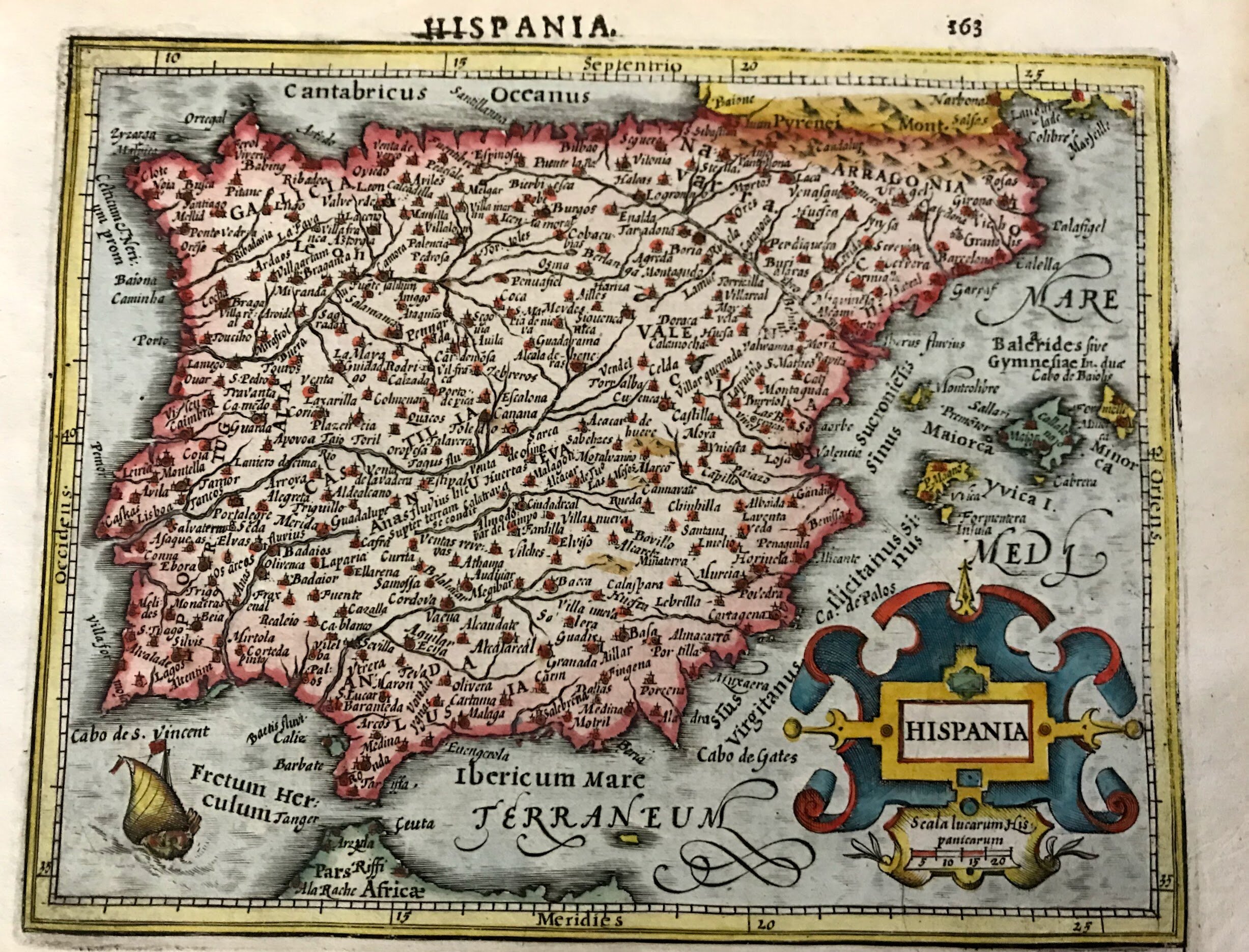 Charming hand colored miniature map of the Iberian Peninsula and the Balearic Islands with considerable detail throughout. A sailing ship is shown entering the Straits of Gibraltar and a large strapwork title cartouche further decorates the map. Latin text on verso.
