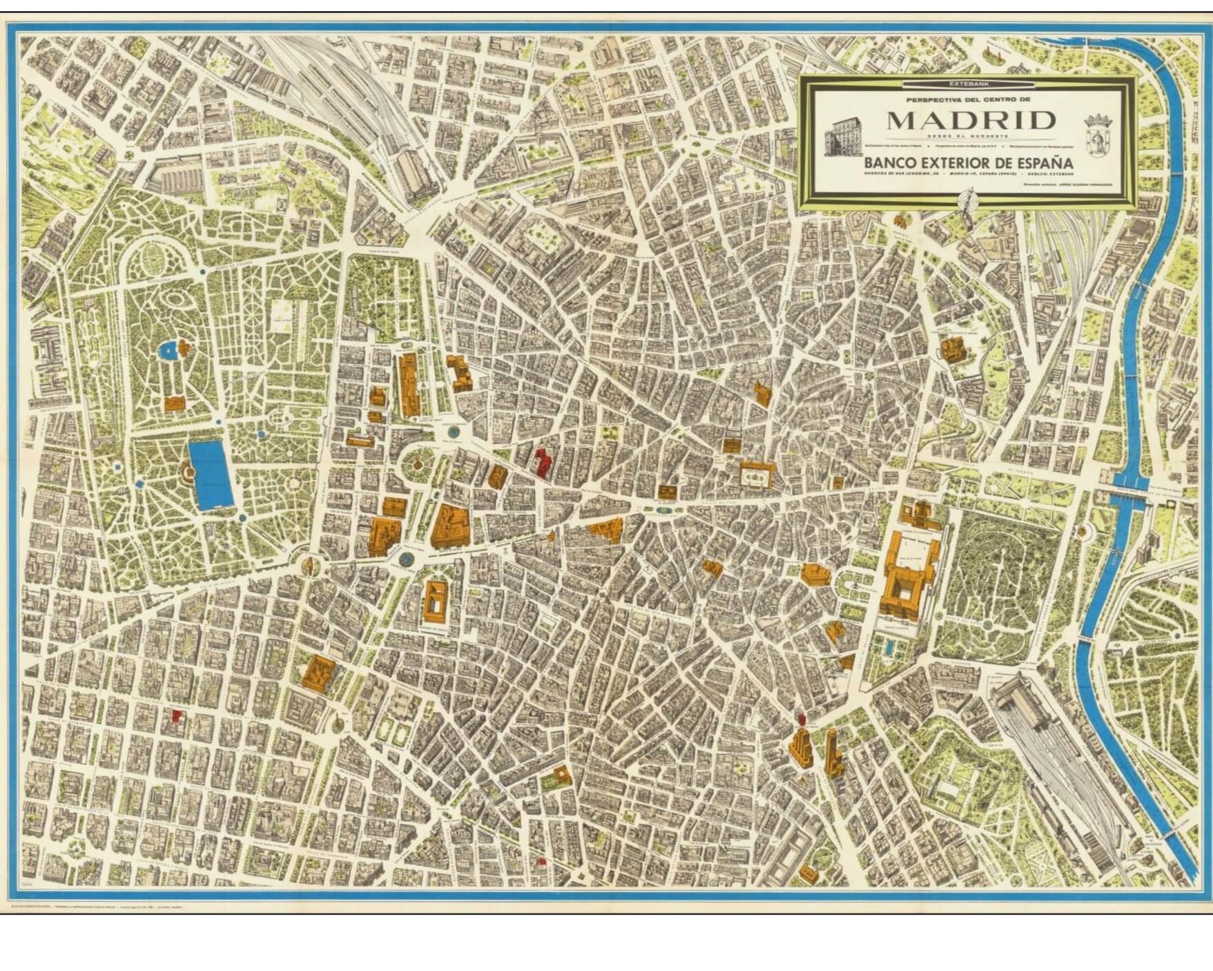Interesting and rare map of Madrid, published for the Banco Exterior de España. This large isometric view is in the vein of Turgot, Blondel La Rougery, and Bollman. Jorge Guzman Hernandez also produced a map of Madrid.